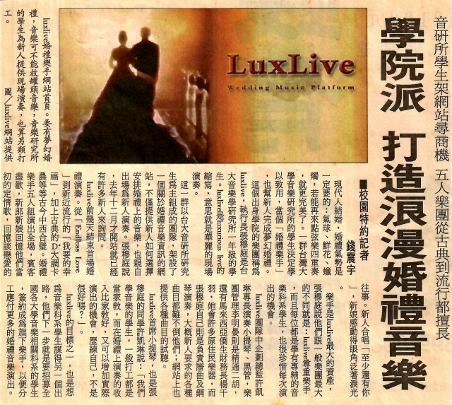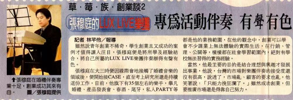 本會會長於 2002 年創辦全台灣第一家婚禮樂團品牌LUXLIVE,並於 2016 年獲文化部「國內音樂系所表演人才就業媒合計畫」獎補助,迄今已成功幫助千餘位音樂系所學生在台就業(開工作室教學、婚禮/商業演出)。